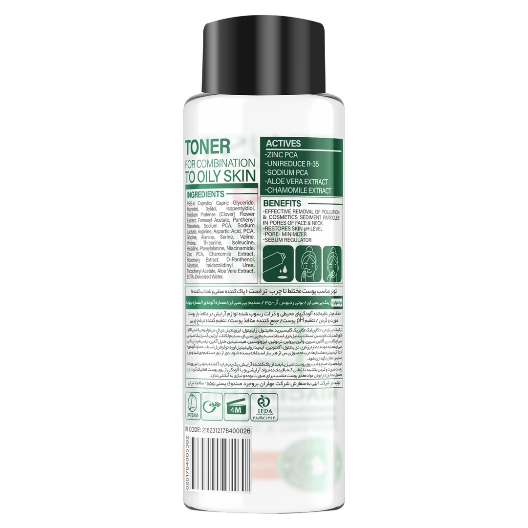 کاربرد: حذف مؤثر باقیمانده آلودگیهای محیطی و ذرات رسوبشده لوازم آرایش در منافذ باز پوست صورت و گردن، تنظیم کردن pH پوست، جمع کردن منافذ باز پوست، رطوبترسانی پوست، موثر در رفع التهاب پوستی